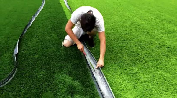 • Lower, align and press the turf on both sides firmly to ensure a tight and seamless joint.